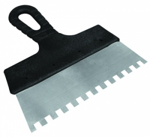 Зубчатые шпатели используют для нанесения равномерным слоем клеевой смеси. Присутствие зубчиков исключает неровность нанесения слоя и перерасход дорогостоящих смесей. В зависимости от вида работ выбирают инструмент с разной величиной зубцов.