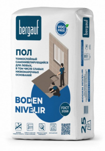По наливным полам (за исключением гипсовых), по цементно-песчаным стяжкам (прочность на сжатие которых > 8 МПа), по плитам перекрытия ж/б и по монолитному бетону (с предварительно заделанными трещинами). Используется под последующую укладку напольных покрытий: напольная плитка, паркет, ламинат, паркетная доска, ковролин, линолеум. Bergauf Boden Nivelir — финишный самонивелирующийся пол на цементной основе, фасовка — 25 кг. 26