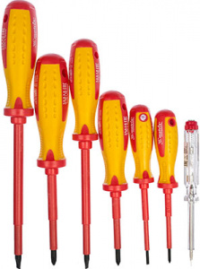 Набор диэлектрических отверток до 1000В, MATRIX PROFESSIONAL 13355 предназначен для работ под напряжением до 1000 В. В наборе 6 отверток ( SL1.2 x 6.5 x150 мм, SL 1.0 x 5.5 x 12 мм, SL 0.5 x 3.0 x 80 мм, РН №0 х 75 мм, РН №1 х 75 мм, РН №2 х 100 мм ) и отвертка-пробник (напряжение 120–250 В). Имеют удобную рукоятку, стержень отверток намагничен.